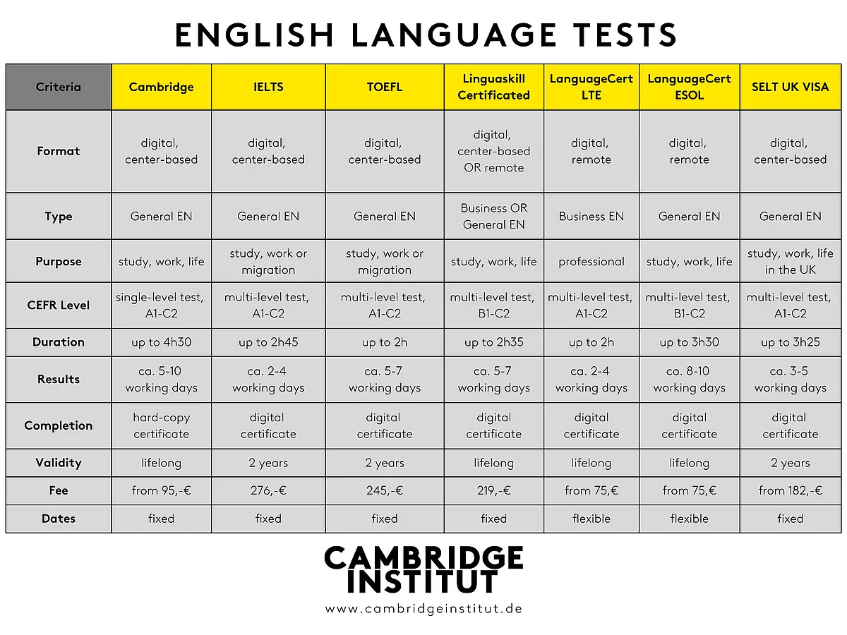 Language certificates can open doors to an international career or a study placement abroad. Even in German universities, proof of language proficiency in English is increasingly required for English-taught programs. Whether it's for your career or studies, the Cambridge Institut in Munich undoubtedly offers the right language examination.